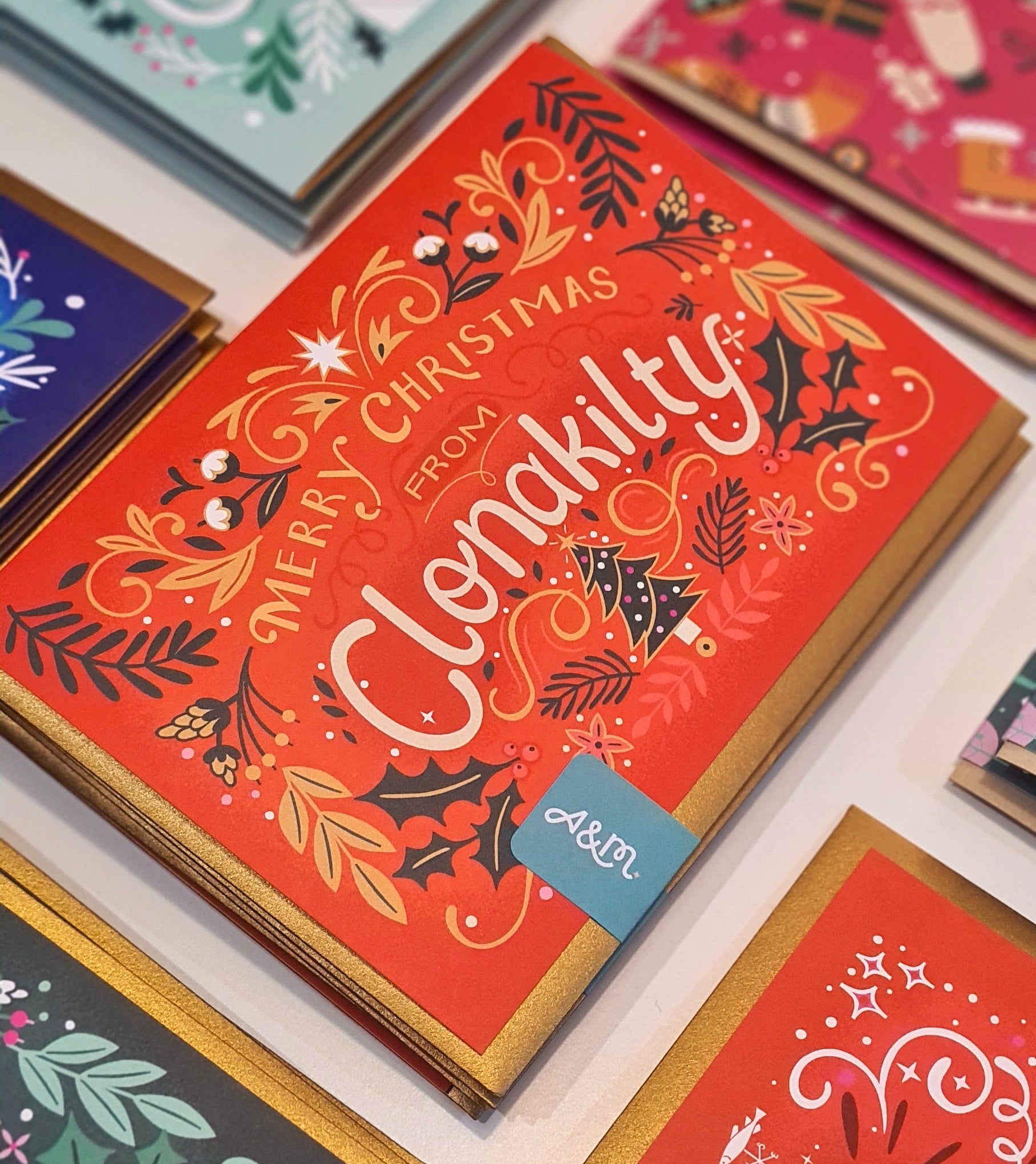 Red Clonakilty themed Christmas card with a beautifully hand-illustrated lettering design by Paula McGloin. unique to Ashe & Mill.